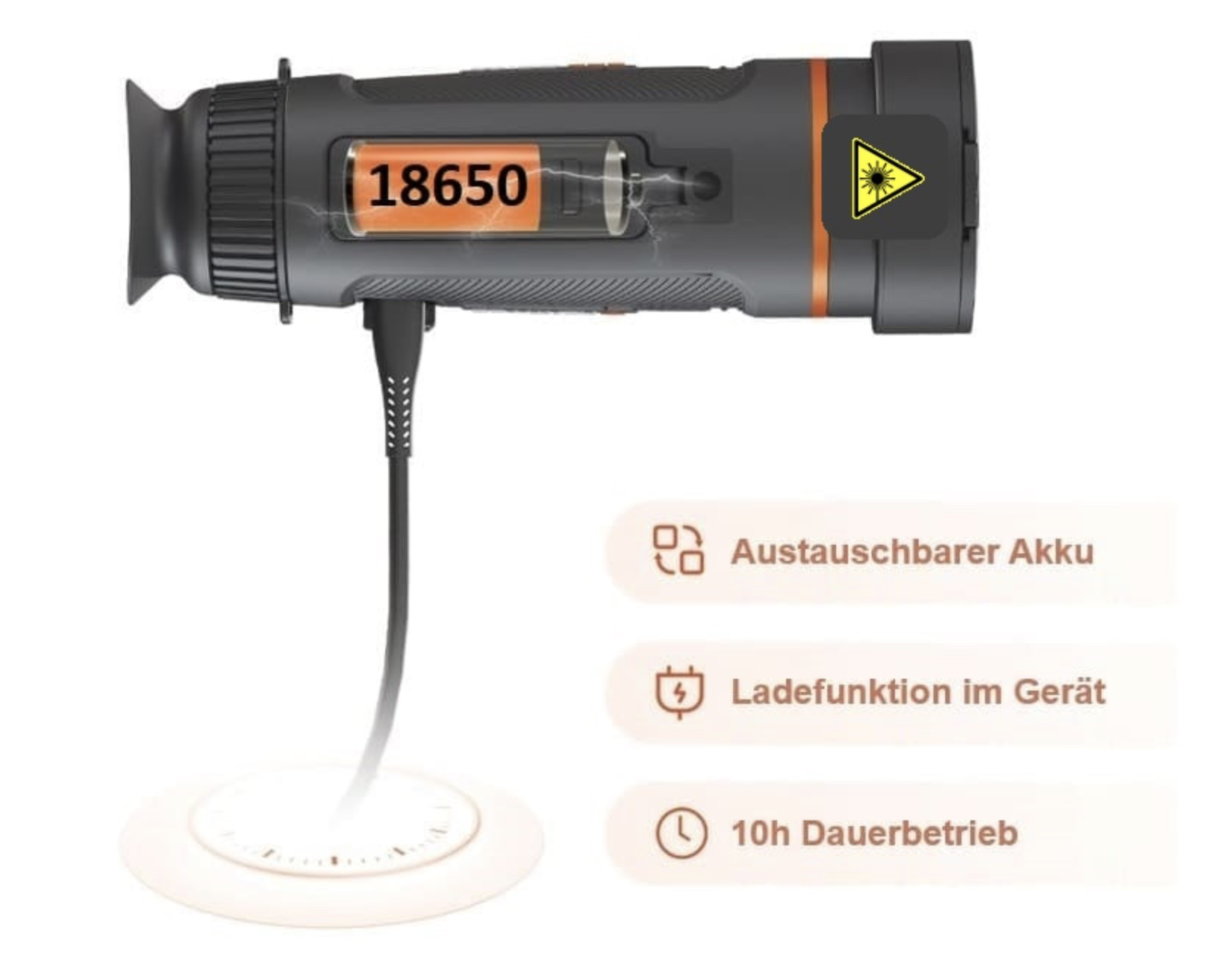 - Neu! Wechselakkusystem mit dem handelsüblichen 18650 Akku und einer gewaltigen Betriebsleistung von bis zu 8 Stunden!