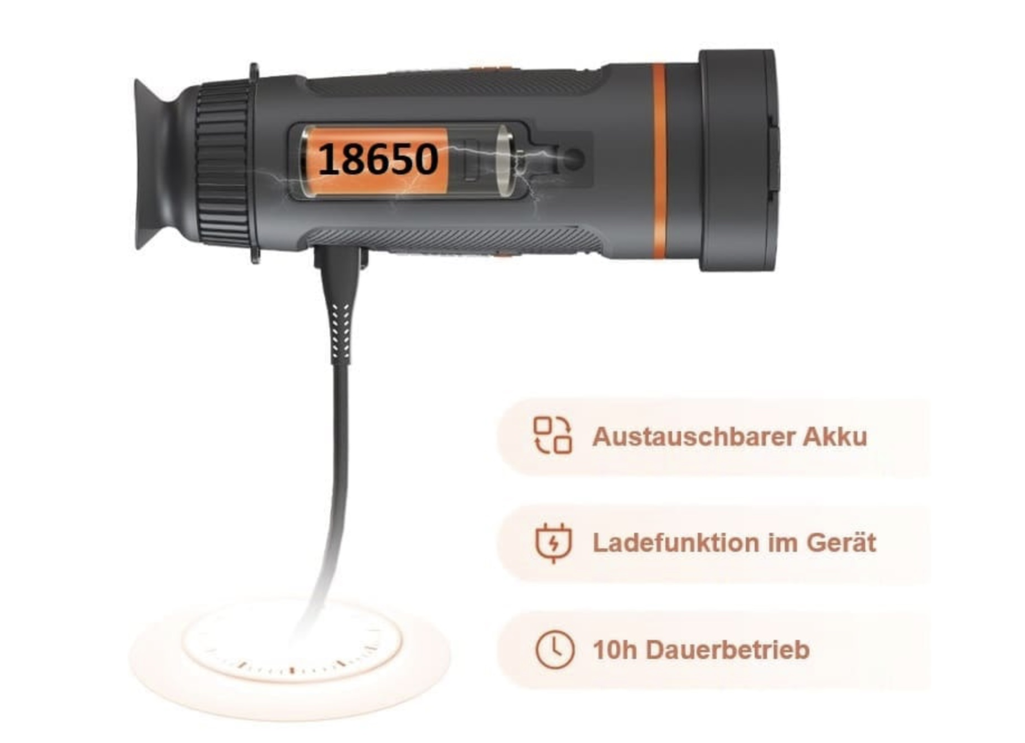 Bei der WILD-Serie handelt es sich um nächste Generation der Cyclops-Wärmebildgeräte. Die WILD-Serie wird die beliebte Cyclops-Serie nicht nur ersetzen, sondern auch in vielen Punkten übertreffen. Das komplette Design wurde überarbeitet und verfeinert und das alles unter Berücksichtigung der Kundenwünsche / bzw. Anregungen. Verbaut ist die neueste Sensor-Technologie mit einer Systemleistung (NETD) von ≤ 18 mK und einem nach neuesten Methoden abgestimmten Bildalgorithmus, wodurch das Bild sehr scharf und kontrastreich abgebildet wird. Die Fokussierung erfolgt nach innovativen Prinzip mit dem oben platzierten Fokussierrad, welcher sich mit einem Finger sehr präzise und feinfühlig einstellen lässt. Zusätzlich besitzt die neue WILD-Serie ein Akkuwechsel-System, welches mit dem beliebten 18650 Akku betrieben wird. Dank des zweiten Akkus, welcher sich im Lieferumfang befindet, wird eine Betriebsdauer von bis zu 20 h generiert.